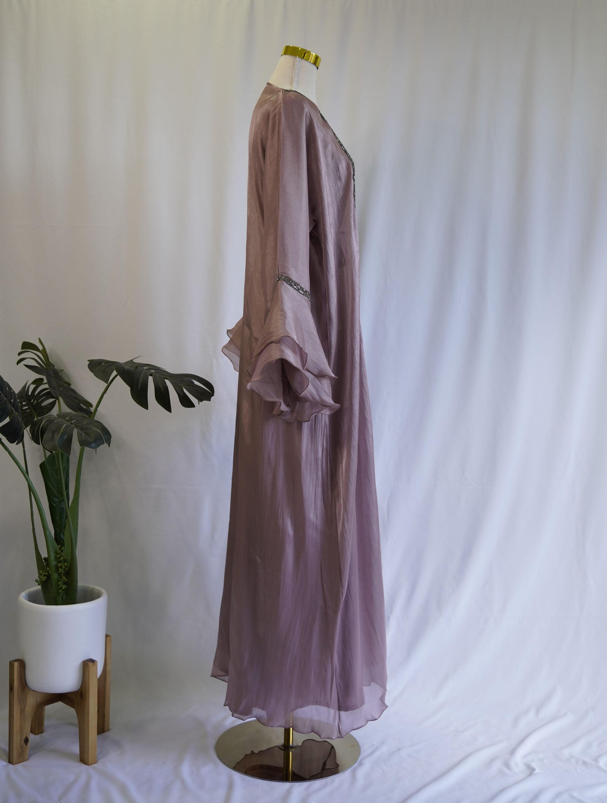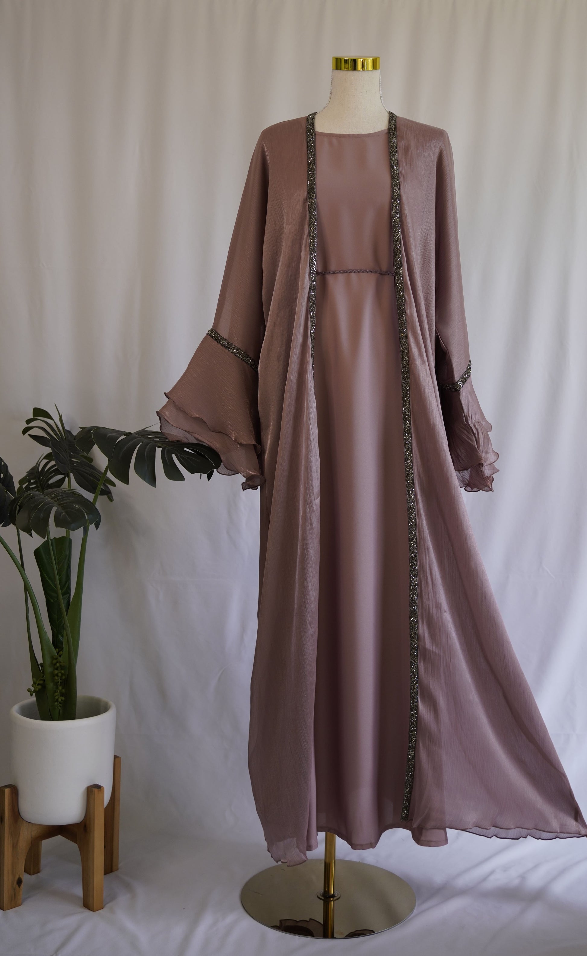 Introducing the Amaara Jacket Abaya Set in Dusty Pink, a graceful four-piece ensemble crafted from premium fabric. The jacket features delicate organza and subtle diamante accents, and a beautiful ruffle sleeve to complete the look.