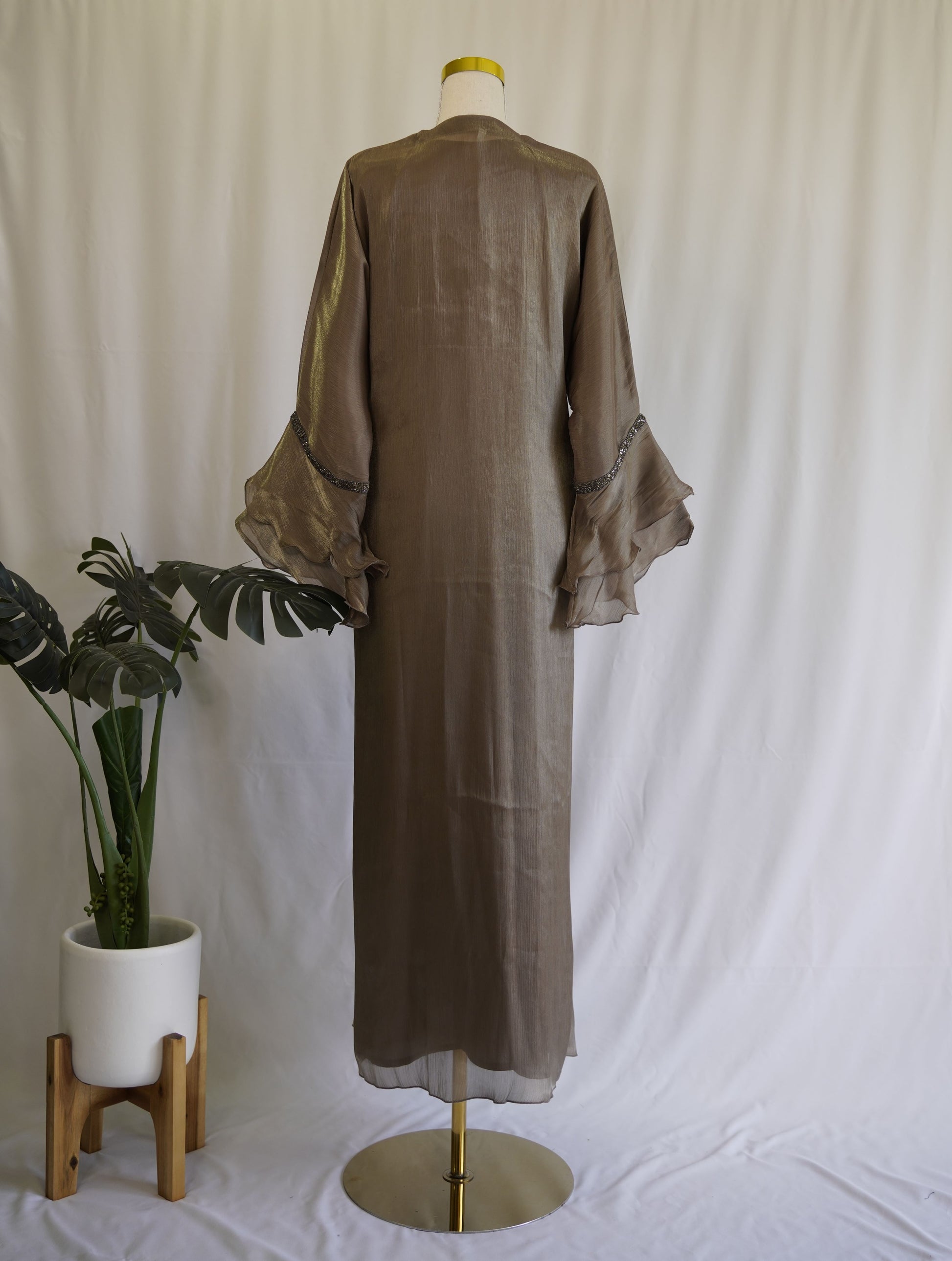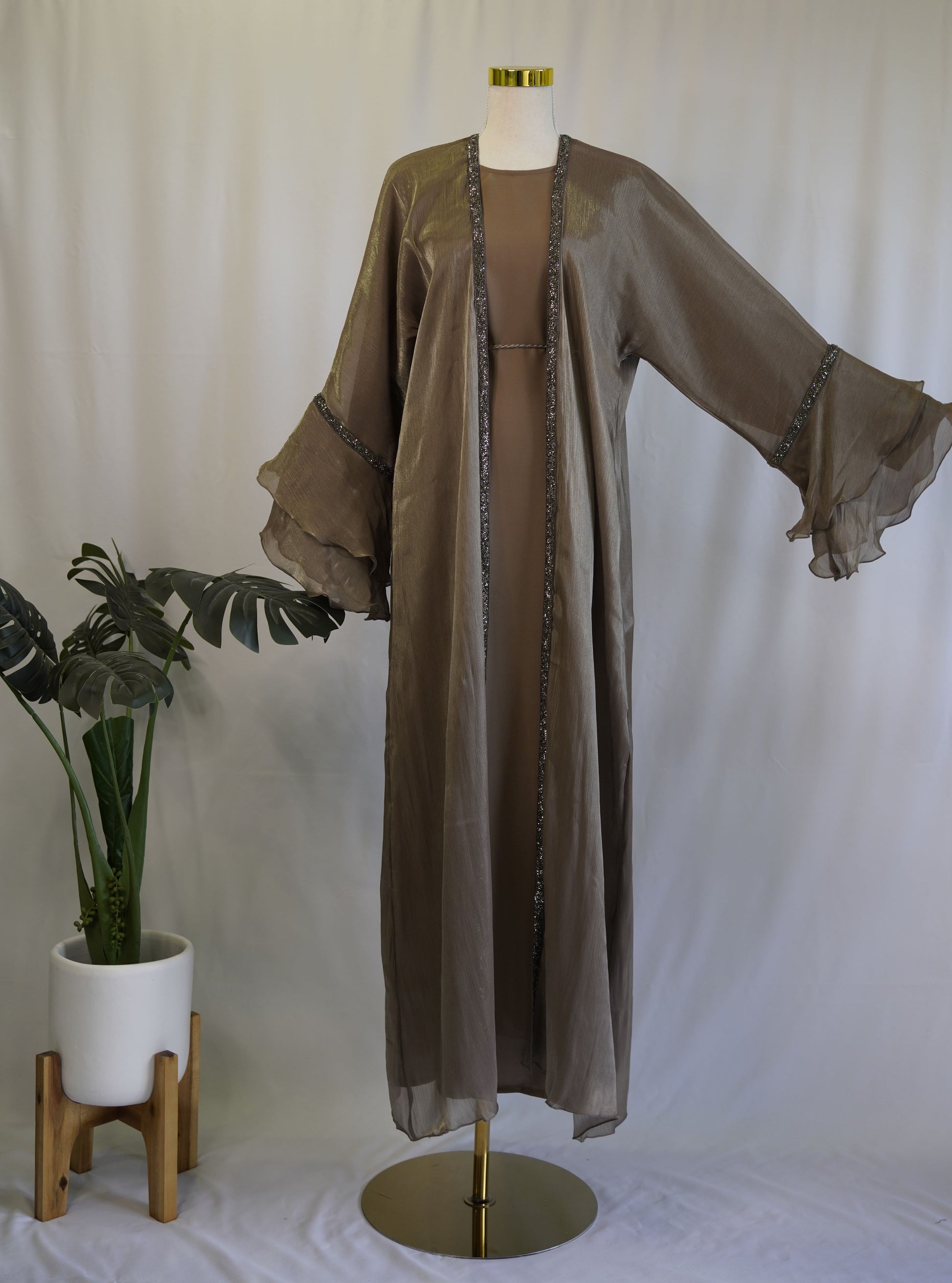 Introducing the Amaara Jacket Abaya Set in Gold, a graceful four-piece ensemble crafted from premium fabric. The jacket features delicate organza and subtle diamante accents, and a beautiful ruffle sleeve to complete the look.