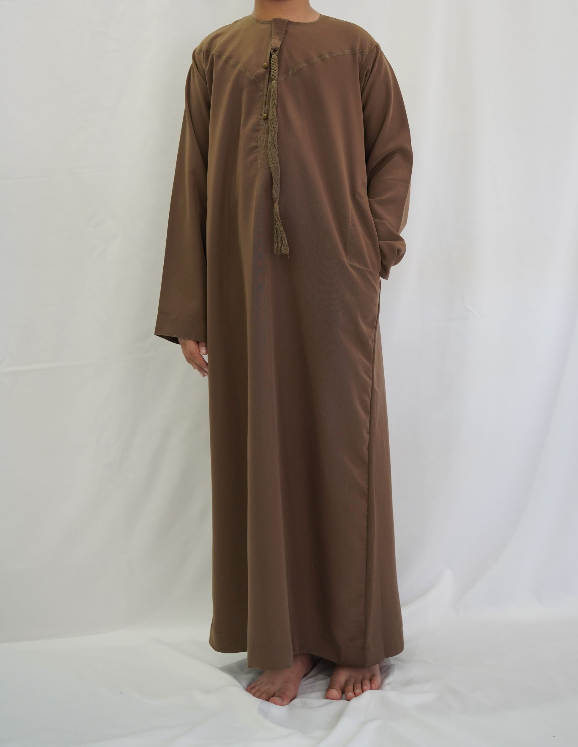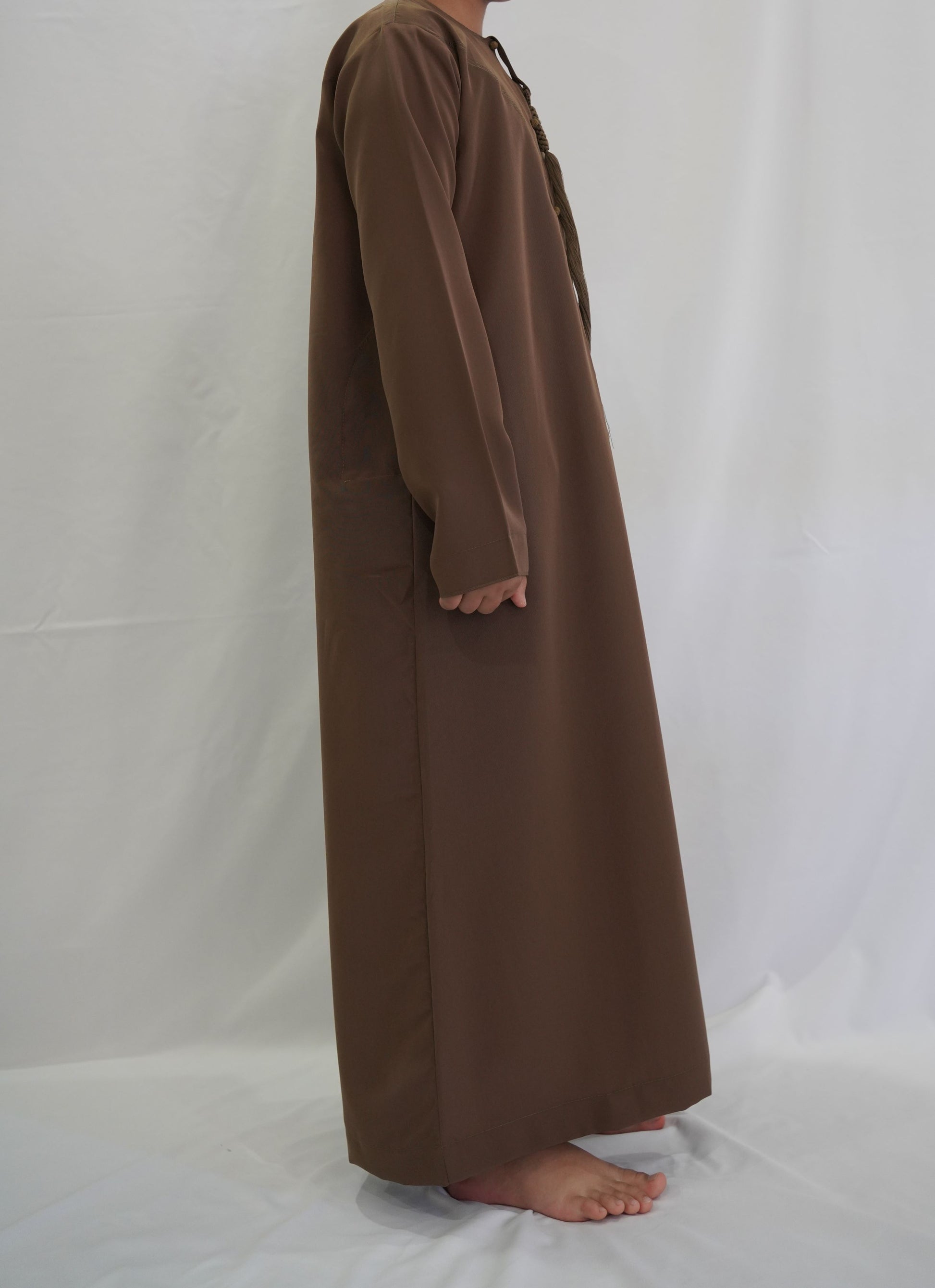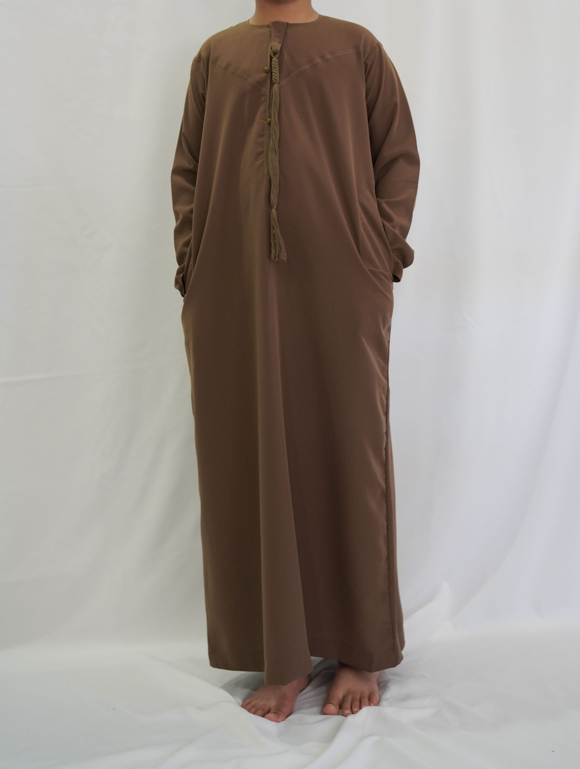 For the boys! A brown emirate style thobe for, perfect for madressah, mosque visits, and everyday wear.