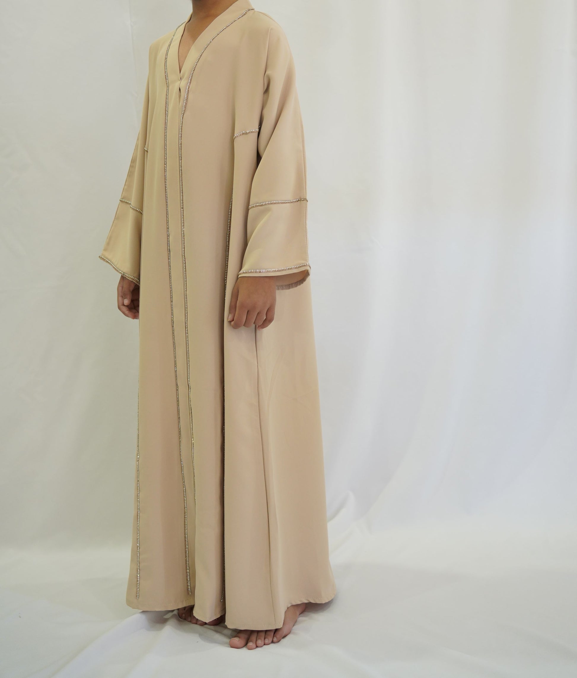 For the girls! A simple and elegant off white abaya with silver and gold diamantes on the bodice and sleeves. Perfect for Eids, nikkahs, special occasions, madressah, mosque visits and more.