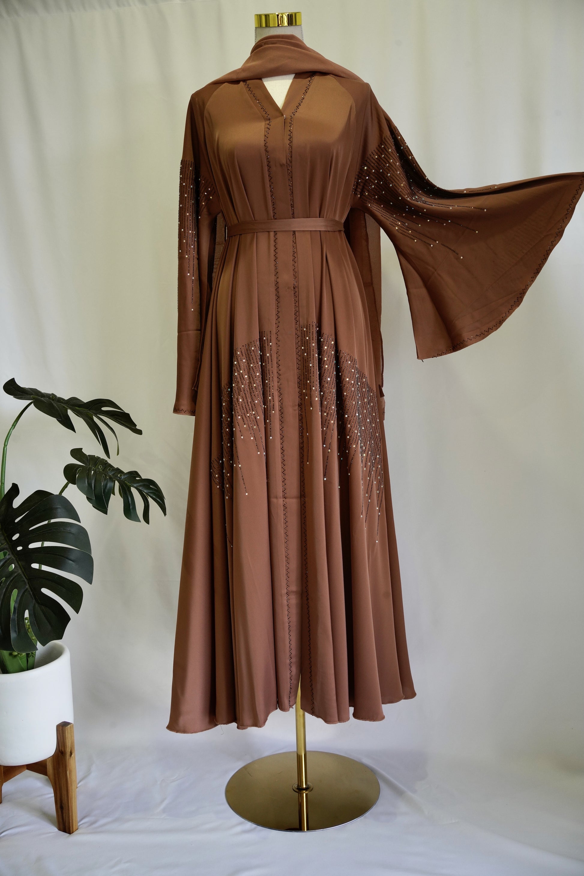 Introducing the Marwa Abaya, a luxurious bronze, silky umbrella-cut design that flows effortlessly with every step. Adorned with a dazzling arrangement of bronze and multicoloured stonework throughout, this piece catches the light beautifully, creating an elegant sparkle in motion. With its rich sheen and graceful drape, the Marwa Abaya is designed to make you feel truly radiant.