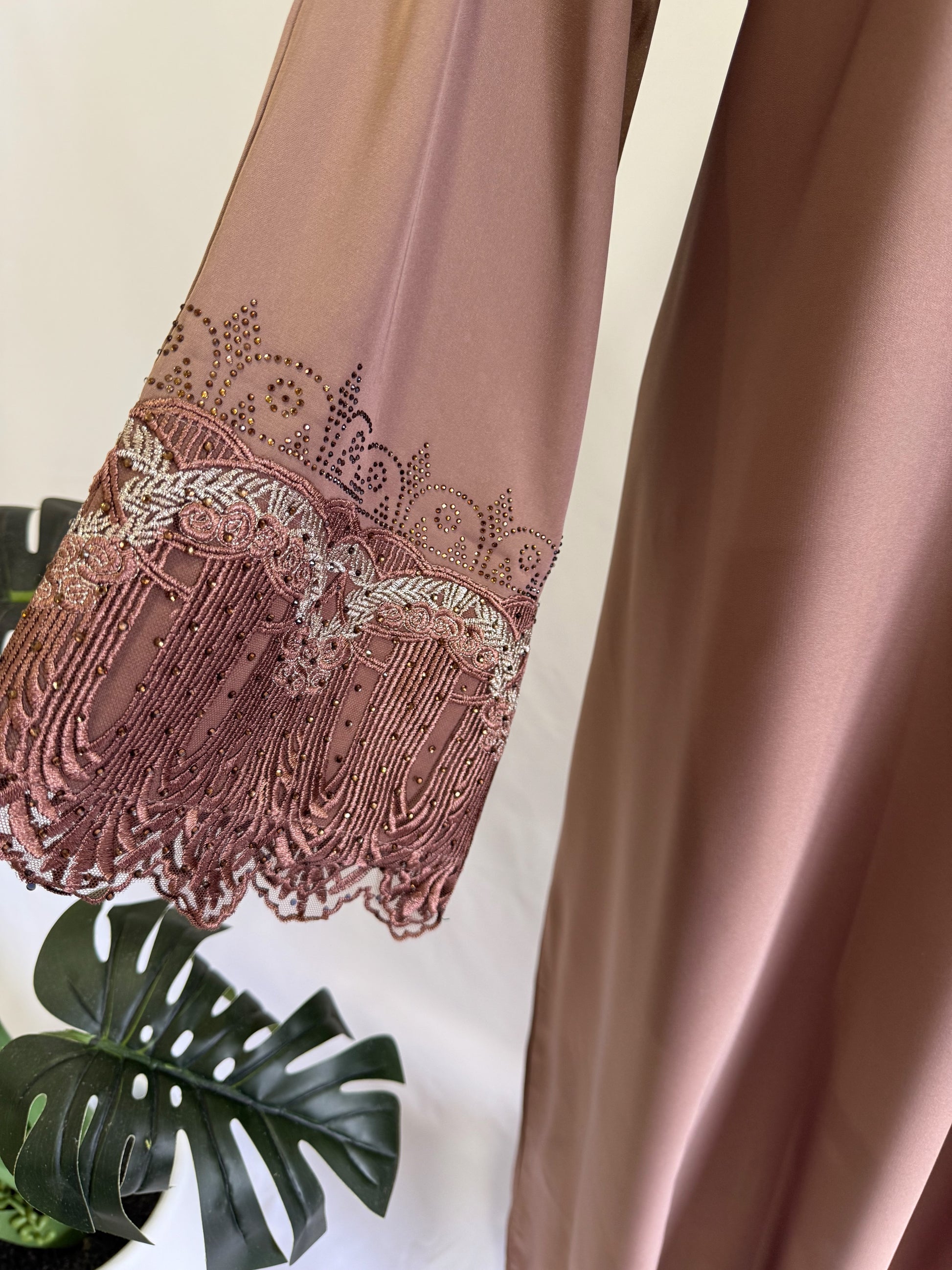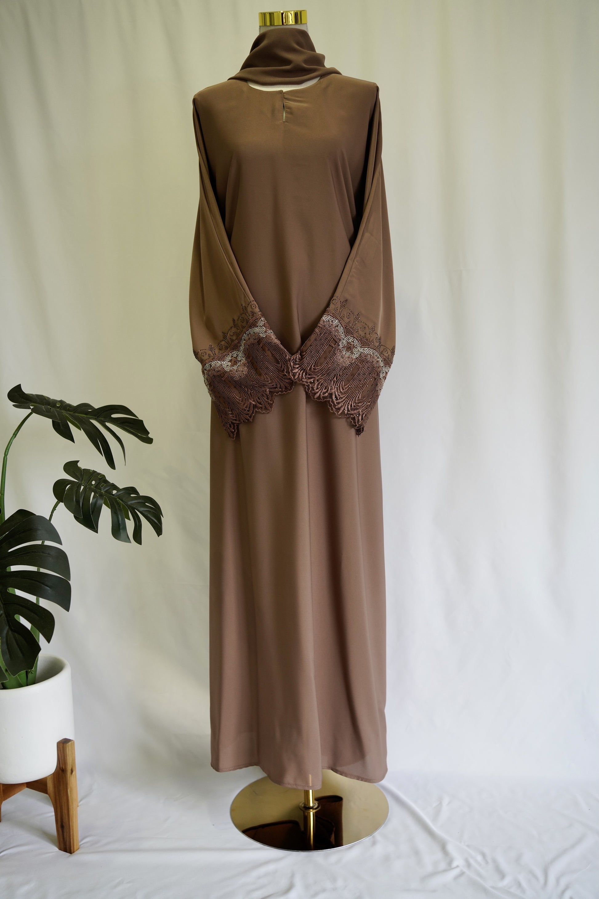 Our Saraa Abaya is a beautifully balanced blend of simplicity and elegance. Designed in a clean, straight-cut silhouette, it comes in a unique muted brown tone. Featuring delicate diamanté-embroidered lace detailing on the sleeves and matching hijab adds a subtle touch of refinement without compromising everyday wearability. Crafted for comfort and ease, this versatile piece is set to become your go-to abaya for effortless daily elegance.