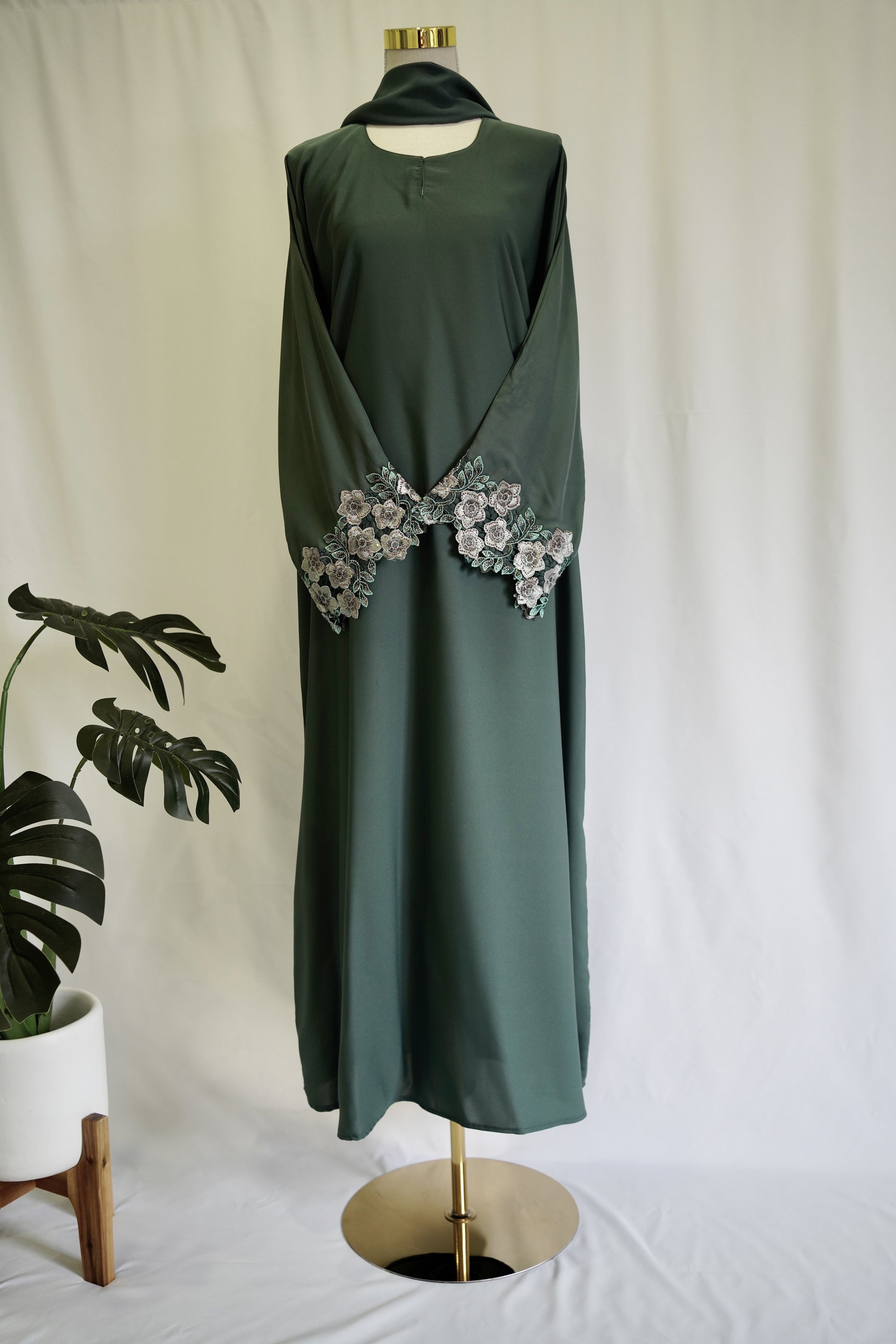 Our Samaa Abaya is a beautifully balanced blend of simplicity and elegance. Designed in a clean, straight-cut silhouette, it comes in a unique muted green tone that feels both modern and timeless. Delicate diamanté-embroidered lace detailing on the sleeves and matching hijab adds a touch of refinement without compromising everyday wearability. Crafted for comfort and ease, this versatile piece is set to become your go-to abaya for effortless daily elegance.